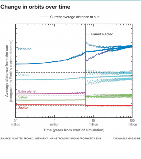 Самый лучший сценарий — который воспроизводил Солнечную систему, наиболее похожую на реальную — включал дополнительную планету, которая находилась между оригинальными орбитами Сатурна и Урана. Этот мир был примерно такой же массивный, как Уран и Нептун, или в 16 раз массивнее Земли. Именно эта планета могла запутаться с орбитой Юпитера и быть выброшена из Солнечной системы.