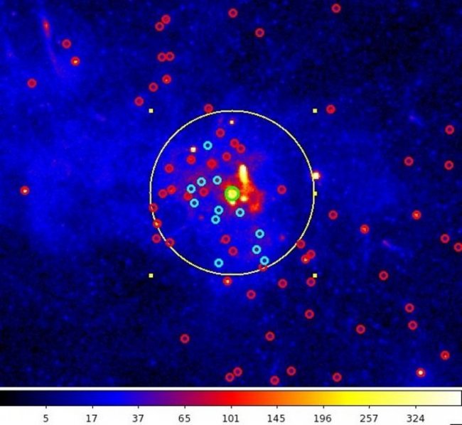 Центральная черная дыра Млечного Пути (отмечена зеленым кругом) в окружении множества рентгеновских источников (отмечены синими и красными кружками), представляющих собой пары из черных дыр и звезд