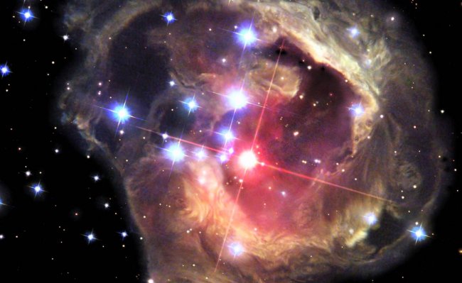 Красный шар в центре этого образа, звезда V838 Mon, окружена множеством пыльных облаков. Эта невероятная фотография была сделана после того, как звезда вызвала нечто светового эха, разбросавшего окружающую пыль по всей вселенной.