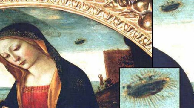 Еще одно известное произведение, «Мадонна с святым Джованнино», было написано в XV веке Доменико Гирландайо и висит теперь в Палаццо Веккьо, Венеция. Если вы внимательно присмотритесь, то увидите: прямо над правым плечом Мадонны в небе изображен странный дискообразный объект. Более того, фигуры мужчины и пса повернут к этому объекту. Специалисты вот уже целый век пытаются понять, что же пытался показать художник на самом деле.