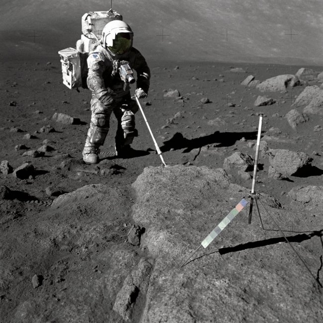 Космонавты вырезали кусочки луны из валуна. Затем, используя грабли, Шмитт соскоблил пыльную поверхность и поднял камешек, который позже назовут «троктолит 76536».