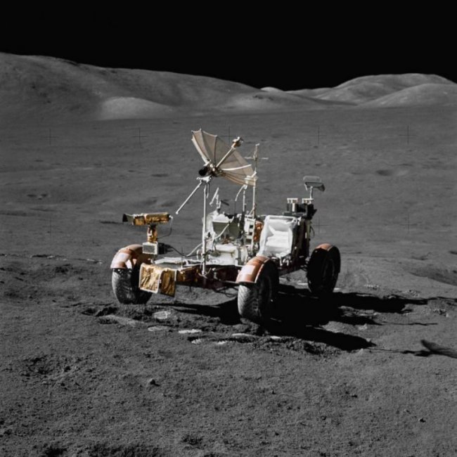 Из энциклопедии «Космонавтика»: «Американские астронавты в 1971-72 гг. при трех последних экспедициях на космических кораблях «Аполлон-15», «Аполлон-16» и «Аполлон-17» использовали для передвижения по поверхности Луны в районе посадки лунный самоходный аппарат «Ровер», доставляемый на Луну в одном из отсеков лунной кабины. Двухместный самоходный аппарат, четырехколесный. Проектная максимальная скорость – 13 км/ч, фактически была достигнута скорость 18 км/ч (при спуске со склона). Ресурс хода – 65 км (фактический пробег составил: при полете корабля «Аполлон-15» – 27,2 км, «Аполлон-16» – 27,1 км, «Аполлон-17» – 35,7 км). Радиус разворота – 6 м, тормозной путь – примерно 3 м. Лунный самоходный аппарат рассчитан на преодоление склонов крутизной до 20°, препятствий высотой до 0,3 м и трещин шириной до 0,7 м.