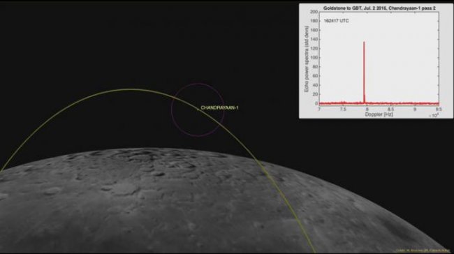 Таким образом, 2 июля 2016 года они отправили луч микроволн на 160 километров (100 миль) над северным полюсом Луны, чтобы увидеть, будет ли отражаться он от поверхности Chandarayaan-1, когда тот будет пролетать мимо на своей прогнозируемой орбите. И ученым улыбнулась удача, так как космический аппарат пересекал луч дважды в течение четырех часов наблюдений.