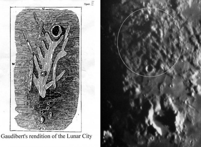 «Но наиболее значительных успехов в раскрытии тайн лунной жизни достиг профессор астрономии Мюнхенского университета Ф. П. фон Груйтуйзен. Впервой четверти XIX века он опубликовал ряд статей, в которых объявлял об открытии на Луне дорог и крепостей. Две светлые полосы, тянущиеся от двойного кратера Мессье, были, по его мнению, транспортными магистралями; однажды он даже различил там какое-то движение. А самая известная его находка — открытый 12 июля 1822 года «город», расположенный близ кратера Шрётер (любопытное совпадение!).