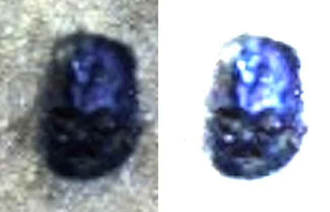 На камне легко разобрать «глазницы» и область «носа» посередине. Ниже что-то вроде рта с «зубами». На природное образование не очень похоже. Это может быть голова робота или голова скульптуры, только очень маленькой. По размер этот камешек менее трех сантиметров в ширину и, судя по фото, он случайно выкатился наружу, когда марсоход оставил колею на поверхности.