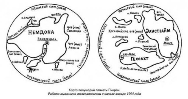 Контактерам передали карту находящегося на Пикране материка Гессахт размерами 4625 х 2250 км в масштабе 1см:125км, на котором помечены 103 крупных города, 6 крупных озер, 10 длинных рек, 2 пустыни и совсем нет больших гор, впадин, лесов, болот.