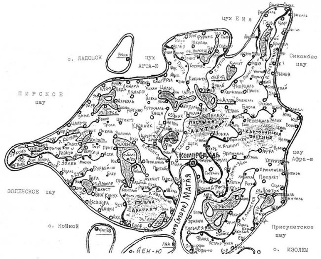 На западе материк омывается Гессалинийским глассом (океаном), на юге — Цурайским, на северо-востоке — Злистраймским цау (морями), на севере — Гыханским цухом (заливом).