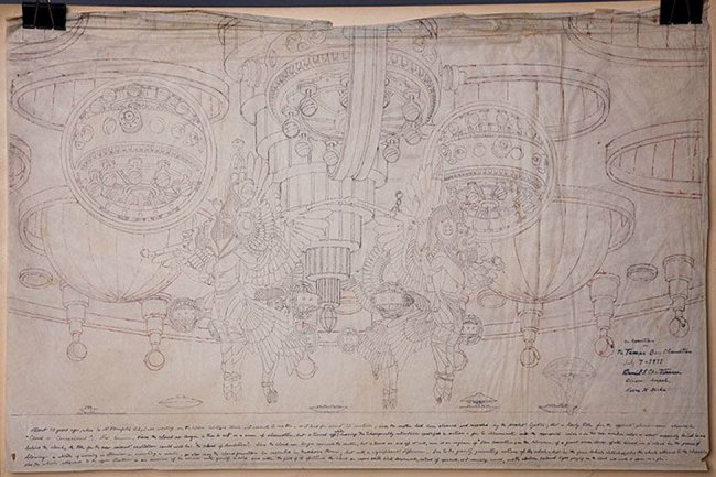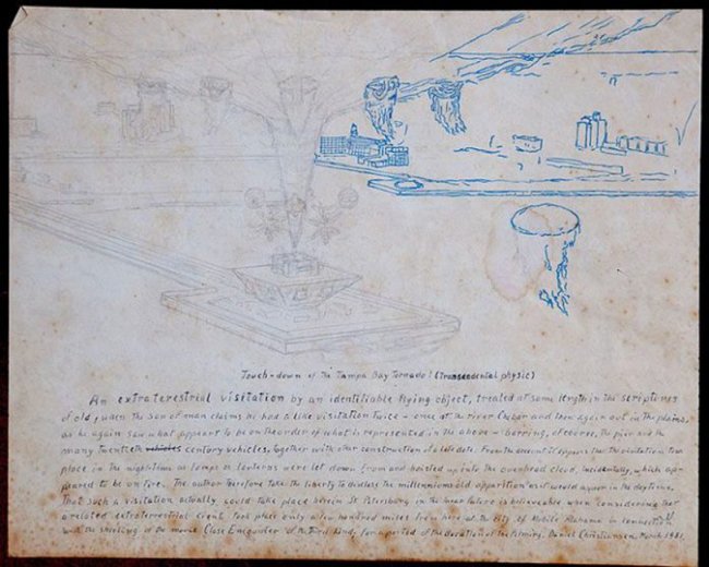 В первую очередь из коробки извлекли целый ворох эскизов НЛО, выполненных рукой профессионала. Летающие тарелки окружают существа о четырех головах — таких, кстати, описывает книга Иезекииля.