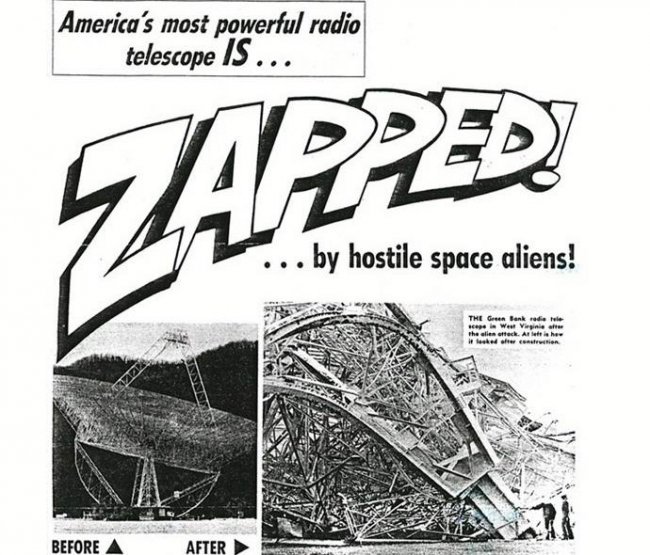 Тогда-то некоторые американские журналисты и посчитали, что устройство было уничтожено представителями внеземной цивилизации. Например, ниже представлен отрывок из газетной статьи, заголовок которой гласит: «Мощнейший радиотелескоп Америки стерт с лица земли враждебными пришельцами из космоса!» Кто-то скажет: «А что еще ожидать от желтой прессы?» Однако не все так просто. В тот раз газетчики, возможно, не ошиблись со столь громким заявлением.