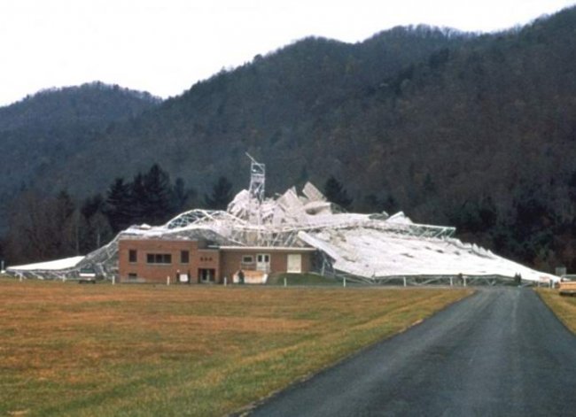 Грандиозное сооружение исправно служило американцам более четверти столетия, и ничто, казалось бы, не предвещало беды. Тем не менее, в один погожий и совершенно безветренный день антенна внезапно разлетелась на части и рухнула на землю многотонной грудой металлических обломков. На место происшествия незамедлительно прибыла специальная комиссия с целью расследовать катастрофу. Впрочем, расследование проводилось недолго, поскольку эксперты якобы не смогли найти видимых причин крушения телескопа. В официальном отчете было указано, что всему виной явилась «усталость алюминиевых конструкций».