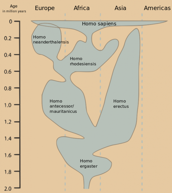 Эволюция проточеловеческого интеллекта сквозь географию и время. Homo egaster жил в раннем плейстоцене между 1,9 и 1,4 миллиона лет назад и обладал мозгом в половину размера современного Homo sapiens. Он изобрел продвинутые каменные орудия труда и укротил огонь. Также был близким родственником Homo erectus. Homo antecessor жил 1,2 миллиона — 8000 лет назад и вышел из Африки в Европу. Наш вид Homo sapiens появился в Африке 2000 лет назад и распространился по всему миру. Homo neanderthalensis имел мозг больше, чем у современного человека, а большие глазницы указывают на более острое зрение. Они исчезли около 300 лет назад, вымерли в процессе конкуренции с Homo sapiens и похолодания климата.