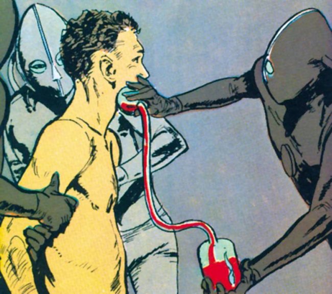 Двое привели Антонио в другую комнату, где у него через длинную трубку взяли кровь. Затем оставили одного, и он прилег на серый диван отдохнуть. Внезапно молодой человек почувствовал сильную тошноту и заметил, что из нескольких трубок на одной из стен выходит пар. Антонио отошел в угол, где его вырвало.