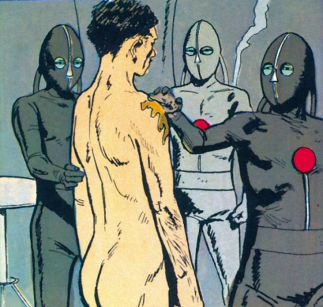 Существа разглядывали находившегося в комнате молодого человека, общаясь между собой на языке, напоминающем лай. Затем его насильно раздели, покрыли тело густой, быстро высохшей жидкостью.