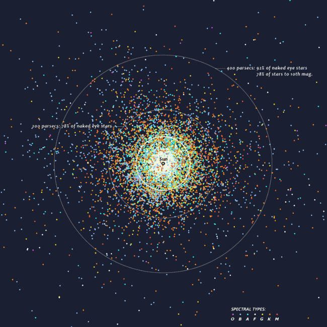 Хотя только в нашей галактике могут быть сотни миллиардов звезд, а в наблюдаемой Вселенной минимум 200 миллиардов галактик, в пределах 40 световых лет от Земли лежит меньше 1000 звезд.