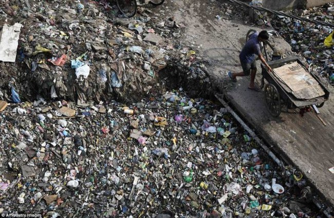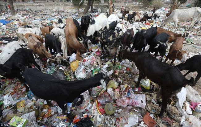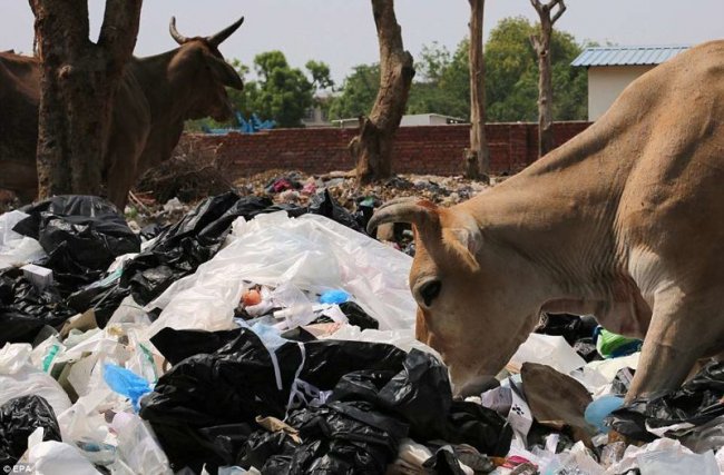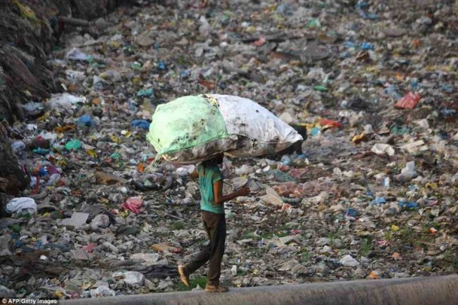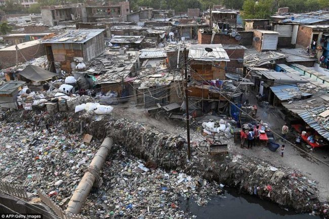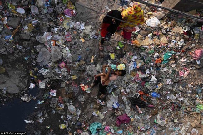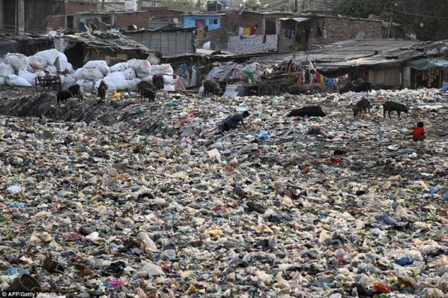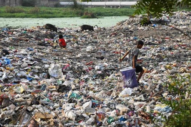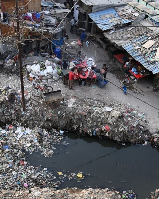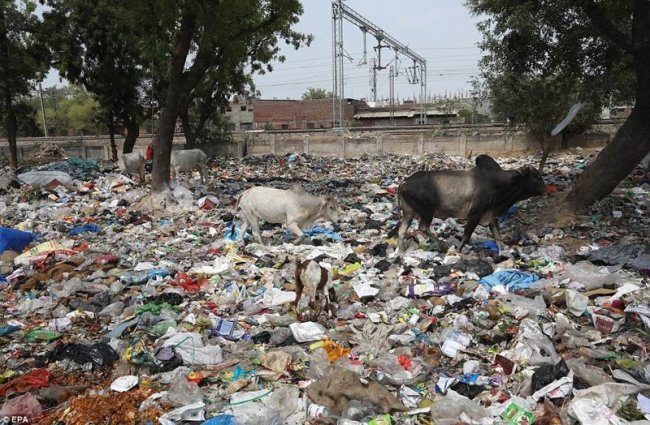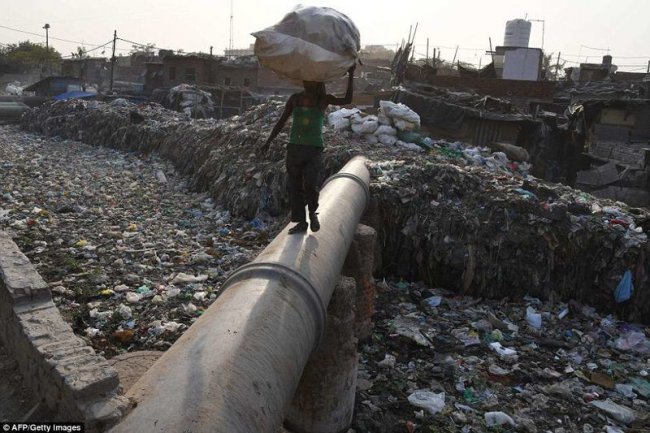 Трущобный район Нью-Дели — Таймур Нагар — завален мусором. Здесь находится сток канализации, по которой приплывают бесконечные пластиковые бутылки, полиэтиленовые мешки, пищевая упаковка и так далее. На фотографиях можно рассмотреть этот кошмар во всей красе: собаки, козы и коровы пытаются чем-то поживиться на огромной помойке, и там же рядом бегают и играют маленькие дети.