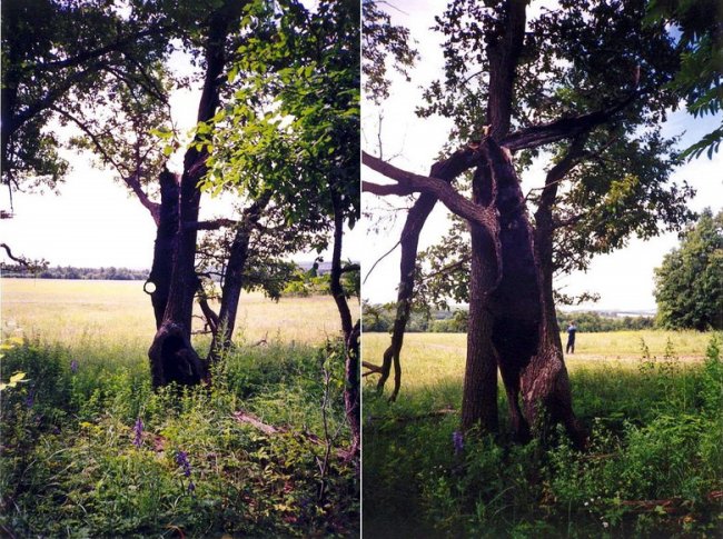 Однако на этом таинственные явления не закончились. Внимание исследователей привлекла росшая на берегу береза с разветвленным стволом. Интересно, что ветки раздваивались, и каждый отросток тоже делился надвое, будто кто-то специально плел этот узор в строгом порядке… А чуть поодаль росли две липы с ветвями, по форме напоминавшими морские волны. Такое впечатление, что их вырезали нарочно. Впоследствии на снимках липовые ветви приобрели сиреневый оттенок.