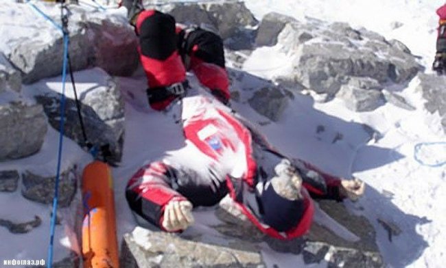 На Эвересте группы альпинистов проходят мимо непогребённых трупов, разбросанных то там то тут, это такие же альпинисты, только им не повезло. Кто-то из них сорвался и переломал себе кости, кто-то замерз или просто ослаб и всё равно замерз.