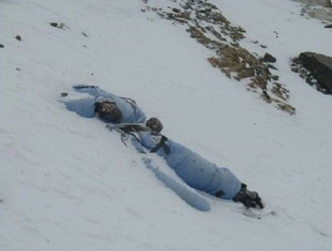 Ветер и снег делают своё дело, те места на теле, которые не прикрыты одеждой, обглоданы снежным ветром до костей и, чем старше труп, тем меньше на нем остается плоти. Эвакуировать мертвых альпинистов никто не собирается, вертолет не может подняться на такую высоту, а тащить на себе тушку от 50 до 100 килограмм альтруистов не находится. Так и лежат непогребенные альпинисты на склонах.