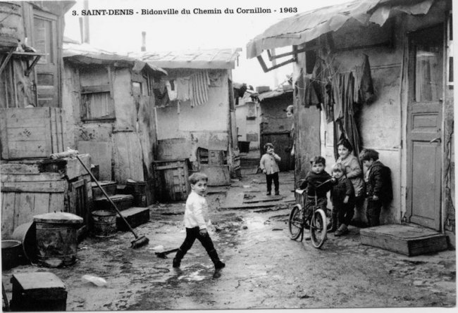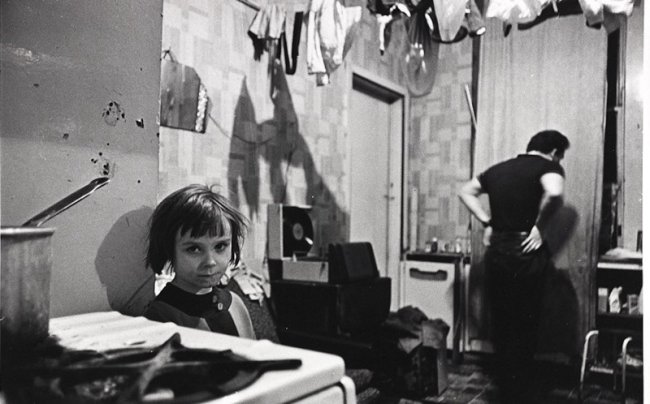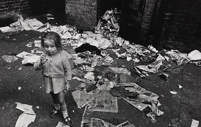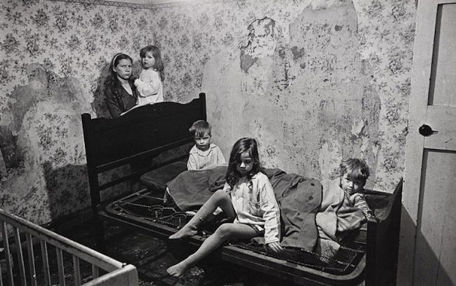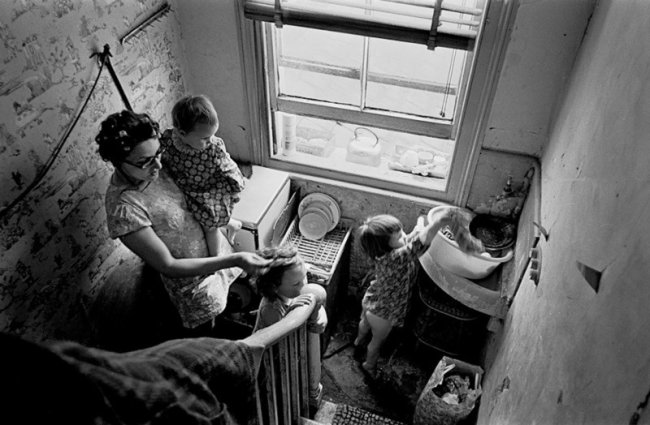 Бирмингем. В квартире нет ни ванной, ни горячей воды. Дети спят, укрывшись старыми пальто и борются за место на матрасе, чтобы не оказаться ночью на пружинах. Кстати, центральное отопление в Британии и ванные/душевые комнаты в домах и квартирах начали появляться только в конце 60х-70х. Старый фонд был просто не приспособлен в таким «изыскам». Вплоть до 70х годов зачастую мылись всего раз в неделю, а ежедневная гигиена сводилась к протиранию тела влажной губкой. Даже если в доме и была ванная, то мыться каждый день было довольно дорогостоящим удовольствием. Только в 60е началось массовое строительство дешевого муниципального жилья, качество таких домов было еще хуже хрущевок, но по сравнению с трущобами — это был прорыв.