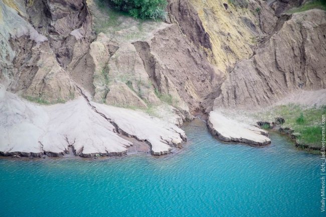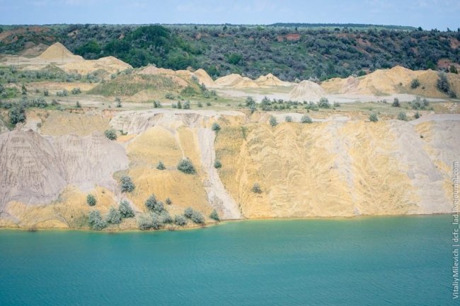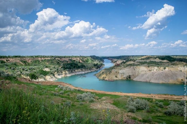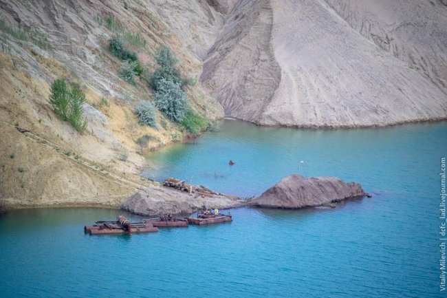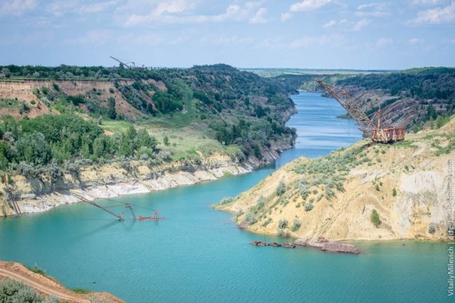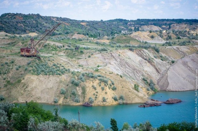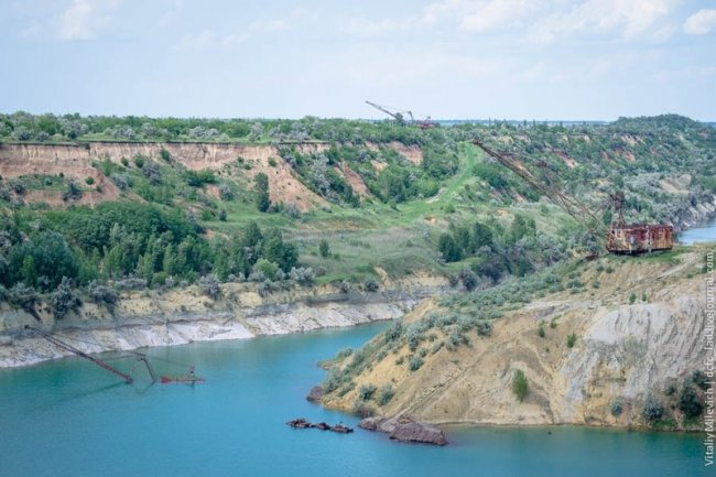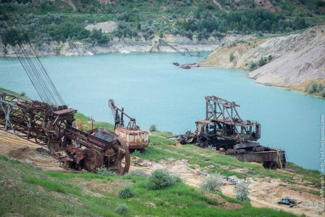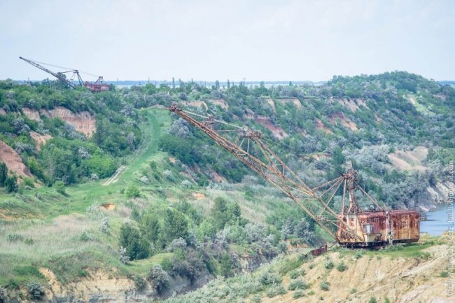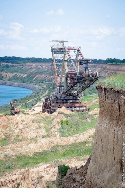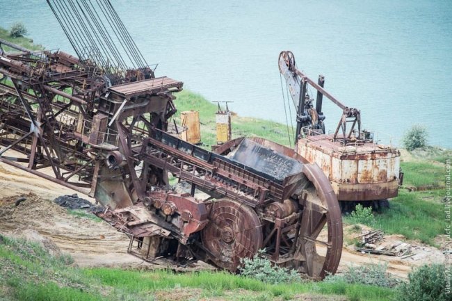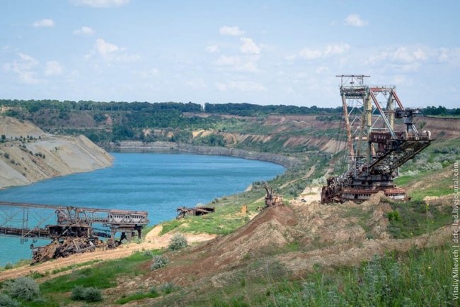 Морозовский разрез — одно из немногих мест Украины, где добывали бурый уголь. Предприятие с горем пополам пережило 90-е и до недавнего времени работало. В 2009 компании отключили электроэнергию — за долги. Техника встала, персонал сократили, карьер быстро заполнился грунтовыми водами. Разрез ждет рекультивация — говорят, его хотят разрабатывать китайцы.