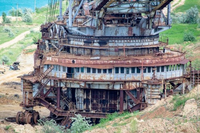 Этот экскаватор разрабатывал карьер. Он шел по краю, срезал верхний слой, после чего драглайны приступали к добыче угля, а он спускался на уровень ниже и копал там.