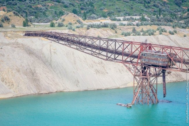 Под водой — линия электропередач, конвейер и еще много чего. Почти утонул и один из шагающих экскаваторов. На фото они кажутся маленькими. На самом деле стрела правого экскаватора — 70 метров, ковш — 10 кубов. Издалека они напоминают скелеты каких-то динозавров. Или жирафов.