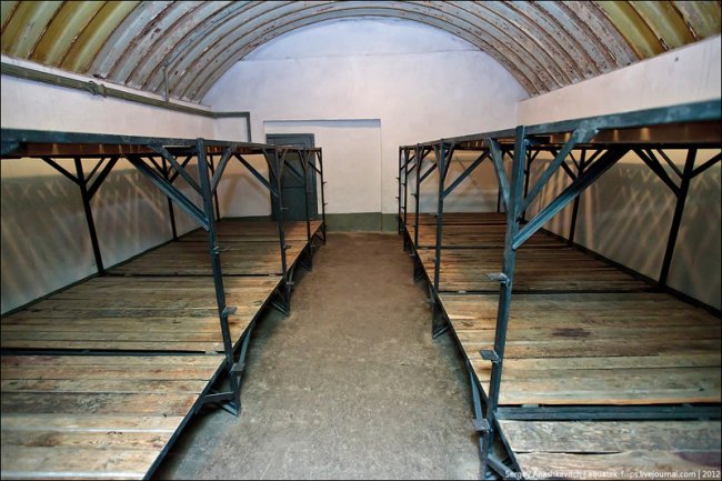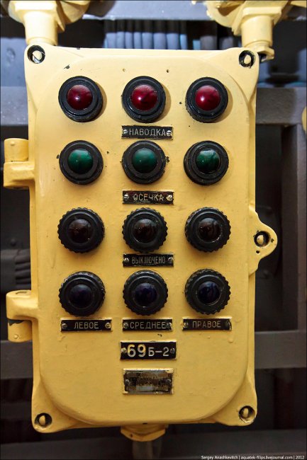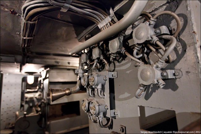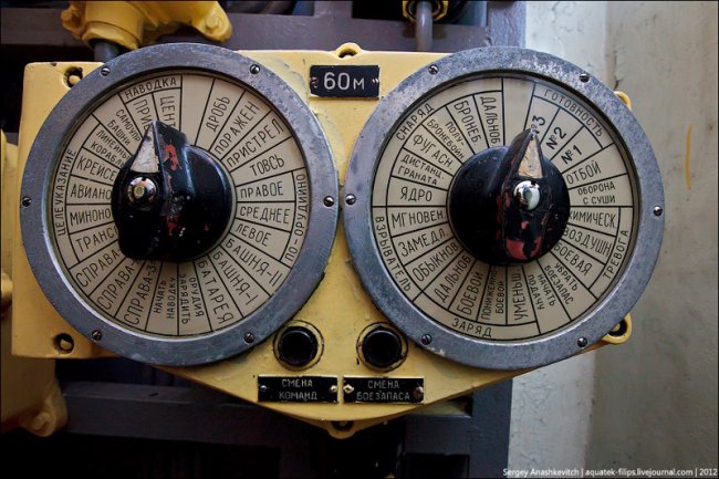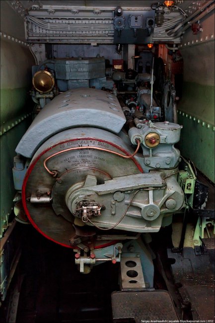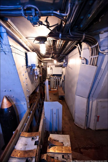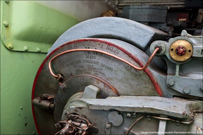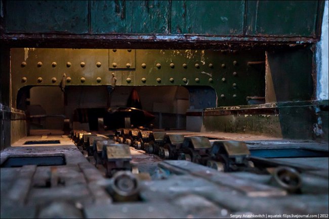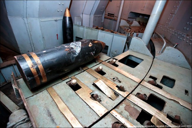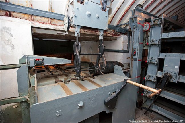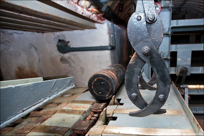 Подающие механизмы снарядов. Снаряды и пороховые заряды хранятся отдельно. На этих стеллажах во время обороны Севастополя находились фугасные, осколочные, осколочно-фугасные, бронебойные, бетонобойные, фугасно-бронебойные, шрапнельные, зажигательные