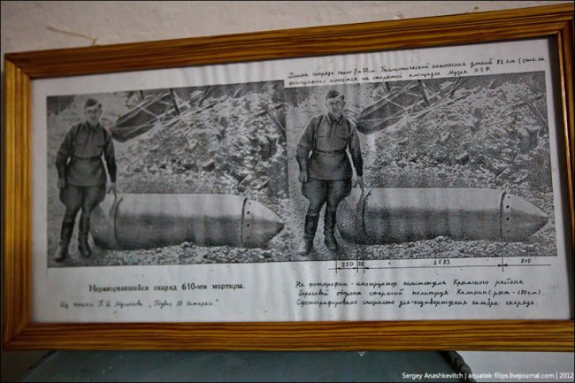 Когда защитники батареи доложили в Ставку Главнокомандования о том, что немцы бьют по батарее 610-мм снарядами, от попаданий которых трескается бетон, им поначалу не поверили. Пришлось приводить доказательства, сделав этот фотоснимок около неразорвавшегося снаряда из мортиры «Карл», попавшего в батарею.