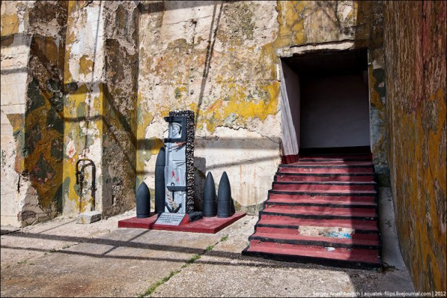 Вход в казематы батареи — подбашенные помещения. У входа установлен памятный знак ее защитникам.