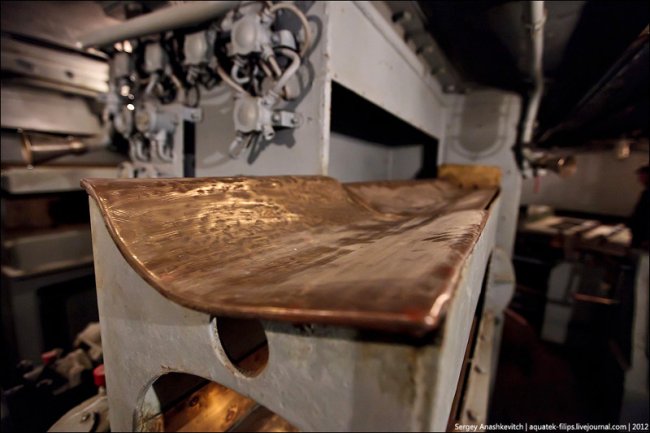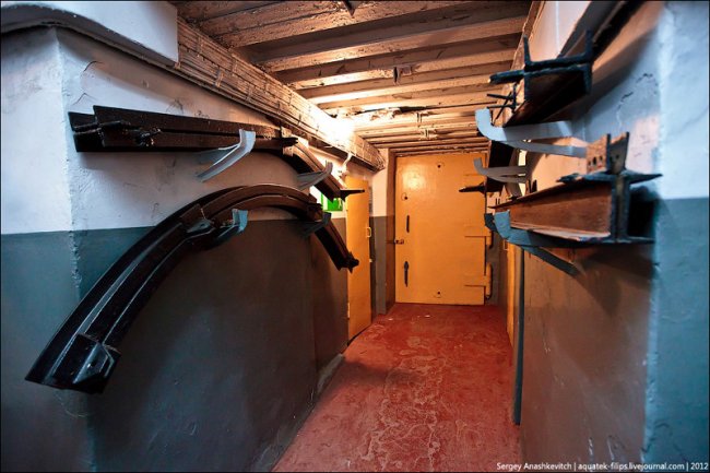 Повсюду на стенах закреплены направляющие, которые используются для подачи снарядов и пороховых зарядов снаружи к месту хранения.
