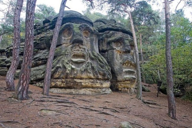 Прогуливаясь по чешской деревне Zelizy, непременно набредёшь на одну из самых странных и мрачных достопримечательностей в Европе. В лесу находятся две головы мистических существ, высеченных в цельной каменной глыбе, которые охраняют лес. Они появились здесь в 1850-х годах благодаря скульптору Вацлаву Леви. Эта скульптурная композиция называется «Головы дьявола».