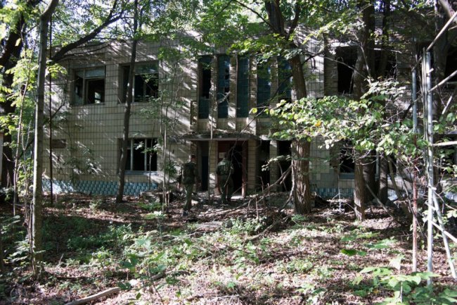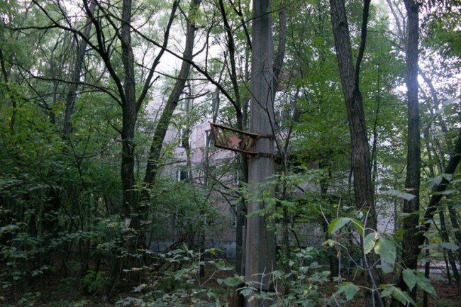 За три десятка лет без людей город почти растворился в лесу. Идешь по узкой асфальтированной дорожке — а это на самом деле бывший проспект. Вдруг смотришь: как-то не в тему возник железобетонный фонарь среди деревьев. Шагнешь в сторону — из зарослей внезапно выступает подъезд серой многоэтажки.