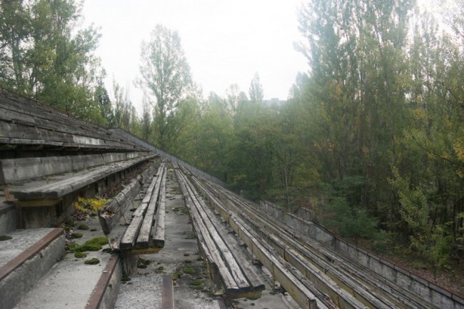От местного футбольного стадиона остались трибуны, осветительные мачты, беговая дорожка. Там, где когда-то гоняли мяч, растет лес высотой с девятиэтажный дом.