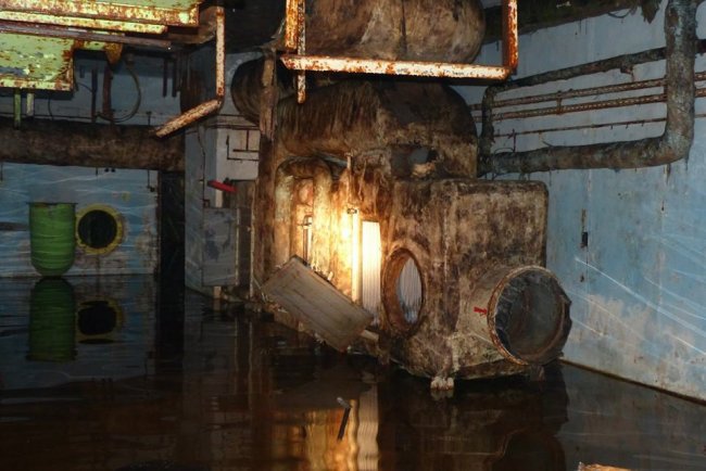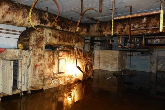 Сквозь квадратное отверстие в стене друзья сумели сделать эту фотографию еще одной большой затопленной комнаты. Что это за машина парни так и не поняли.