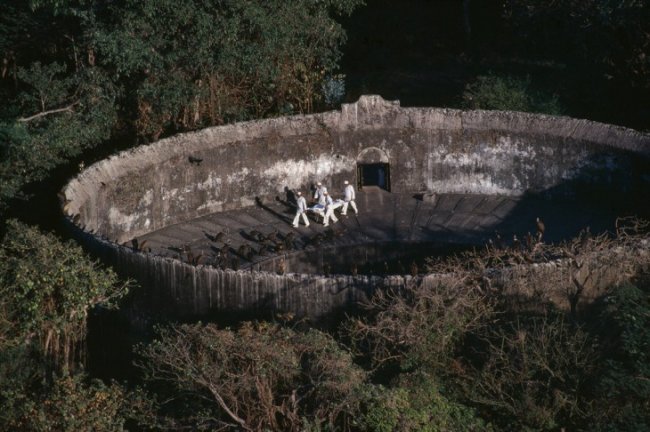 Дахма представляет собой круглую башню без крыши, которая состояла из трех частей: для мужчин, для женщин и для детей.