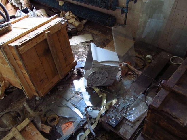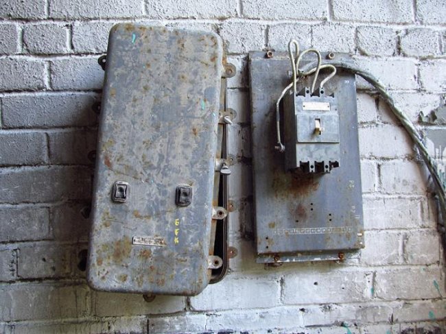 На стене — раскуроченный распределительный щит: очевидно, местные обитатели давно уже вытащили отсюда всё, что представляло хоть малейший практический интерес.