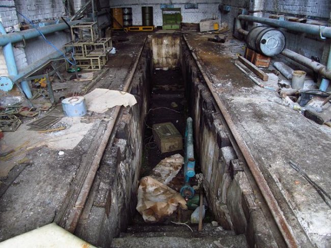 Впрочем, паутина внутри обнаружилась лишь самая обычная. А ещё — рельсы вокруг ямы: это помещение явно было предназначено не для ремонта «Жигулей».
