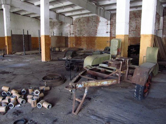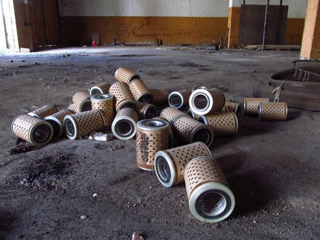 Рядом с прицепами валяется россыпь уже знакомых воздушных фильтров. Военные покинули это место много лет назад, и при виде практически новеньких бумажных фильтров на сыром каменном полу и маслянисто поблёскивающих колёсных дисков прицепов отчего-то становится слегка неуютно. Правда, тени здесь не шалят — лежат точно в соответствии с законами физики, но бодрый аллюр как-то сам собой непроизвольно сменяется на осторожную поступь.