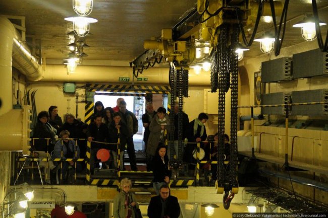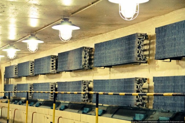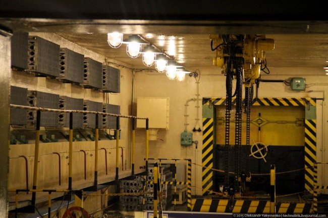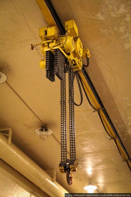 33. Спуск «изделий» на нижний уровень арсенала, где размещались камеры хранения, осуществлялся при помощи подвешенного под потолком крана. Слева на снимке видны радиаторы охлаждения, которые я сперва принял за батареи отопления.