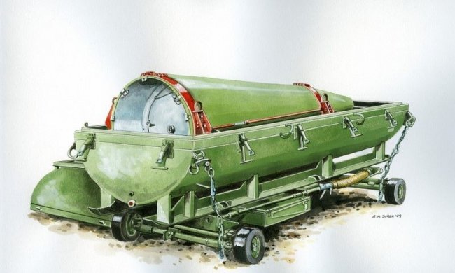 Так выглядела боеголовка для ракеты 3P10 в контейнере, установленном на тележке. При помощи цепей, контейнер с тележкой крепился к полу для обеспечения безопасности в случае колебаний грунта, вызванных атомным взрывом.
