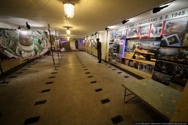 39. Осмотрим сперва складские помещения, в которых размещались ядерные боеголовки. Они представляют собою вытянутые комнаты прямоугольной формы с характерными отверстиями на полу для крепления тележек с контейнерами. Чтобы чем-то заполнить пустоту этих помещений, музейные работники создали в каждом из них информационные уголки, посвященные различным темам.