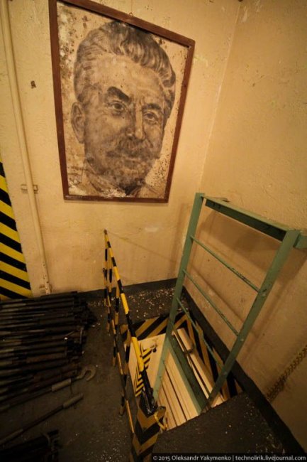 55. Рядом с лестницей для поддержания общего коммунистического антуража вывесили портрет одного известного «эффективного менеджера», который с исторической точки зрения сюда не вписывается никак, ведь бункер был построен гораздо позже развенчания культа личности.