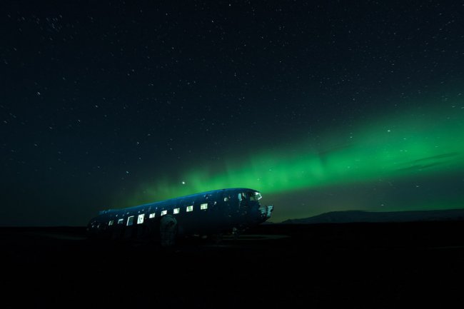 «Где-то на южном побережье Исландии лежит давно забытый самолет Douglas DC-3. Я приехала туда в 4 утра и, как мы и ожидали, полярное сияние постепенно появилось на горизонте. Я наслаждался этим волшебством до рассвета и использовал 90-секундную выдержку, добавив немного света внутрь самолета»