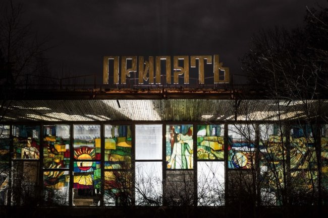 «Бывшее кафе в Припяти. Я хотел подчеркнуть красоту витража и создать нечто уникальное с помощью длинной выдержки и светографики. Мы поставили один источник света внутри здания, второй — за вывеской «Припять», а третий — перед ней»