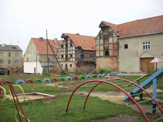 Довольно странно увидеть смесь истинно-русских покрышек для детских игр и немецких фахверковых домов.