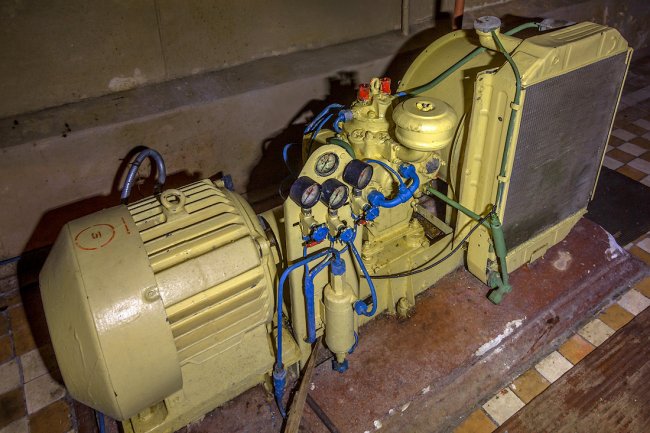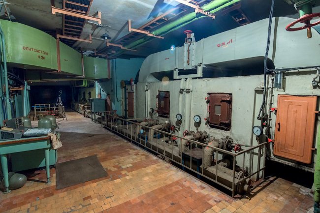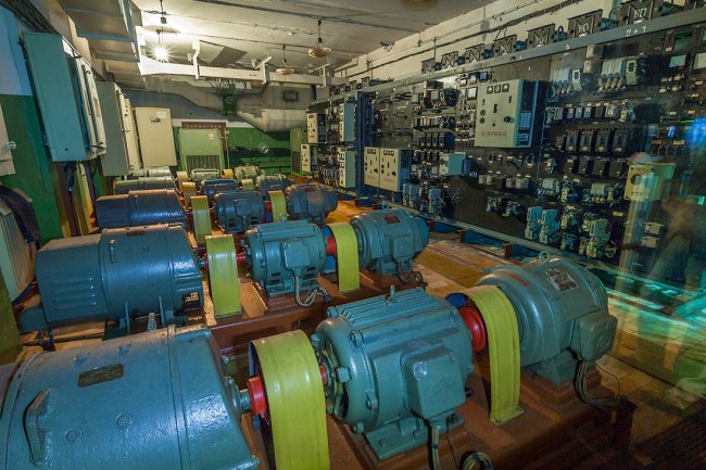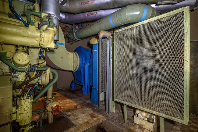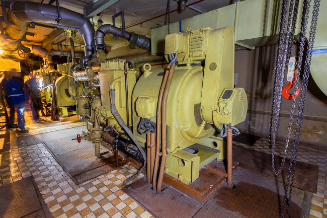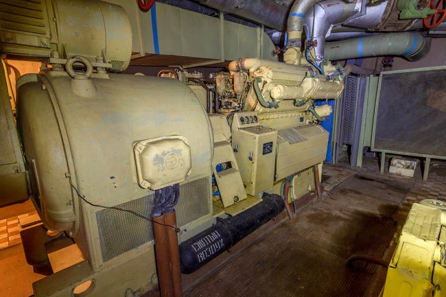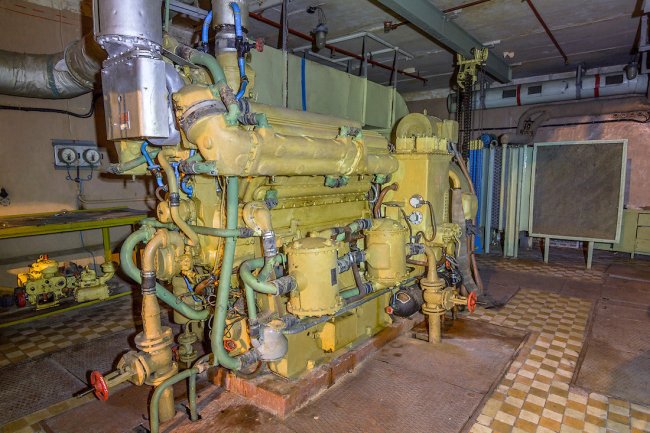 65. Святая-святых бункера — помещение с тремя судовыми дизель-генераторами мощностью по 500 киловатт каждый.