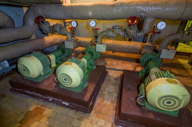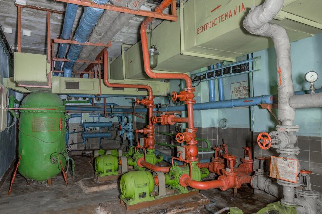 44. На объекте было несколько насосных станций. Цвет водопровода соответствовал их назначению в системах комплекса. Синий — вода для питья и хозяйственных нужд, красный — система пожаротушения. Здесь же стояли электронагреватели. За стеной зала располагались резервуары для хранения воды.