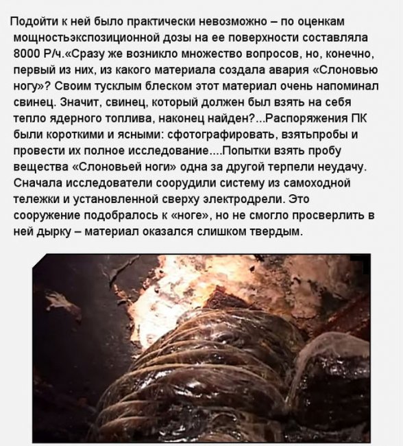 Зона отчуждения Чернобыльской АЭС таит в себе множество загадок, большая часть которых скрыта от посторонних глаз в разрушенных помещениях самой станции. Одной из таких загадок, которую долгое время пытались решить исследователи и ликвидаторы последствий взрыва, стала некая субстанция под названием «слоновья нога».