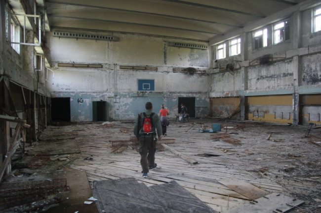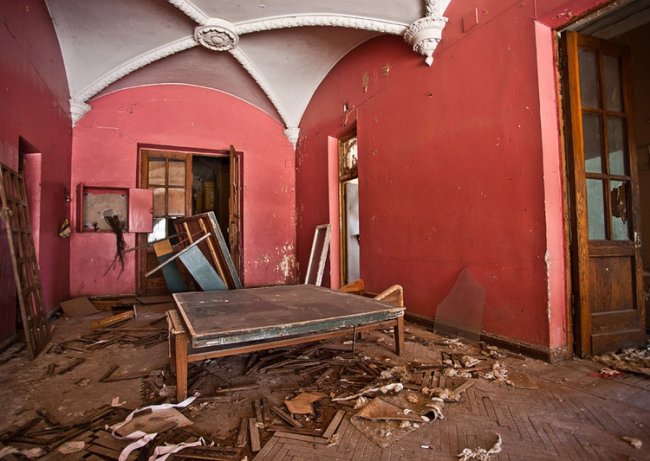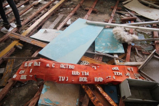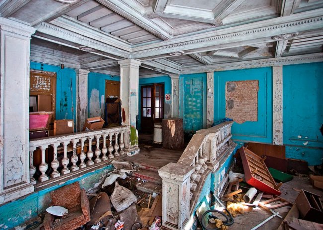 Внутри картина другая. Везде валяется мусор, окна выбиты. В комнатах — разломанная мебель, изорванные старые книги и фотографии. Сейчас здание почти разрушено, а половина его сгорела, и в этой части даже стен почти не осталось.