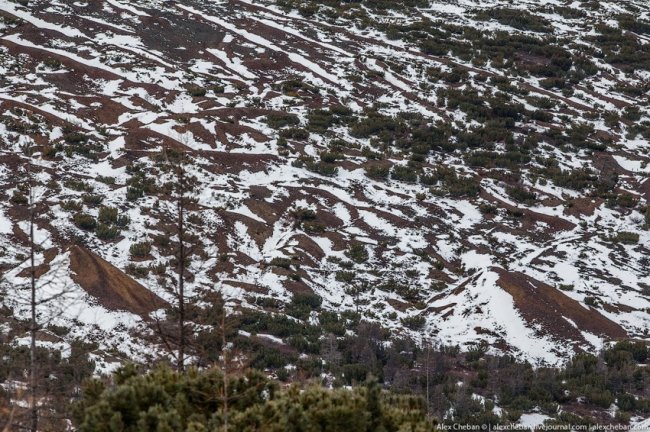 Вся сопка напротив конторы была покрыта извлеченной из недр пустой породой. Гору будто вывернули наизнанку, изнутри она была бурой, из острого щебня, отвалы никак не вписывались в окружающую зелень стланика, которая тысячелетиями покрывала склоны и была уничтожена одним махом ради добычи серого, тяжелого металла, без которого не крутится ни одно колесо, — олова. Повсюду на отвалах, возле рельс, протянутых вдоль склона, у компрессорной копошились маленькие фигурки в синих рабочих спецовках с номерами на спине, над правым коленом и на фуражке. Все, кто мог, старались выбраться из холодной штольни, солнце грело сегодня особенно хорошо — было начало июня, самое светлое лето. (П. Демант)